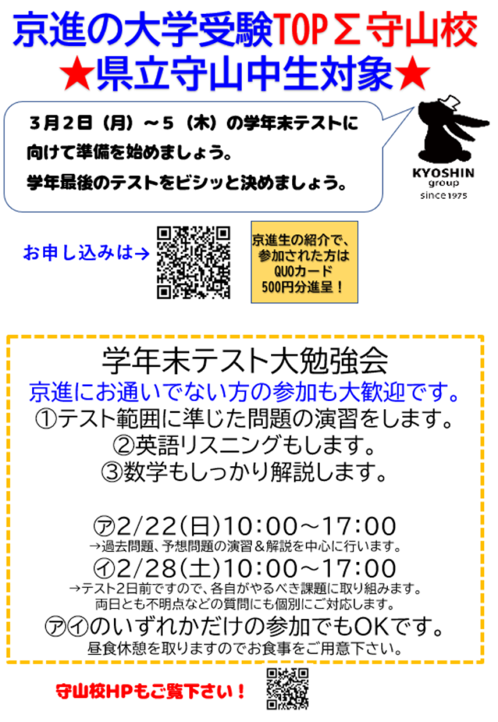 県立守山中1・2・3年生対象 学年末考査 大勉強会をします。