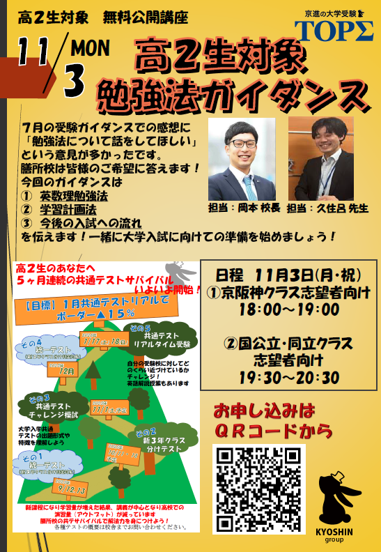 TOPΣ膳所校では夏に受験ガイダンスを実施しました。そのアンケート結果(今後に実施して欲しいガイダンス)で多かったのが勉強法「受験に向けた普段の勉強の仕方についての話が聞きたい」でした。自分自身にあった勉強のやり方は人それぞれですが、長年の経験における「効率的且つ効果的な」学習方法をお伝えします。入試の話もするので夏に参加出来なかったひとも安心してご参加下さい。ガイダンス後には個別質問にもお答えします。(質問多数の場合は後日に回答もしくは面談をさせて頂きます。)