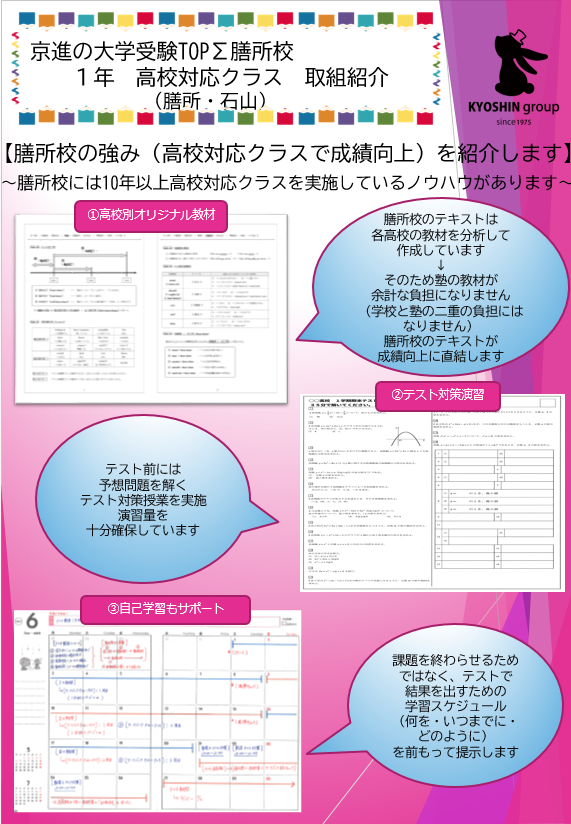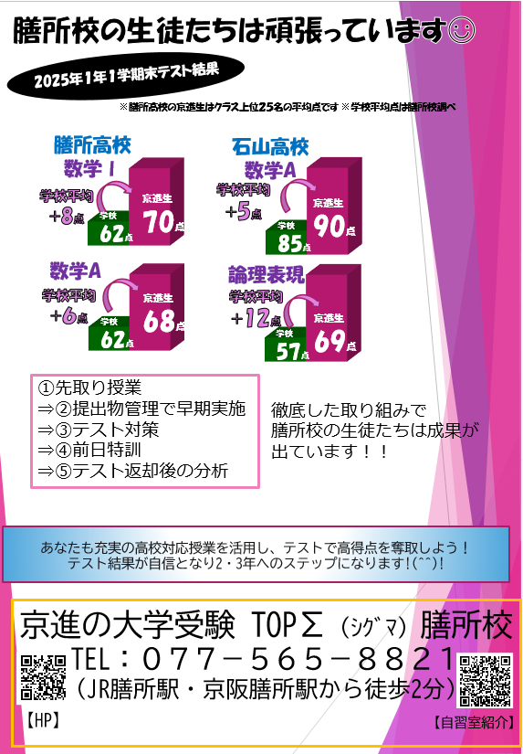 TOPΣ膳所校のでは京大選抜クラスと高校対応クラスがあります。今回はその中で高校対応クラスについて紹介します。まずは【イベント&ニュース】にある授業体験や様々なイベントに参加してみて下さい。Σ膳所校で頑張っている京進生に更に仲間が増えることを楽しみにしています。一緒に目標に向かって切磋琢磨し、楽しく学習しましょう。