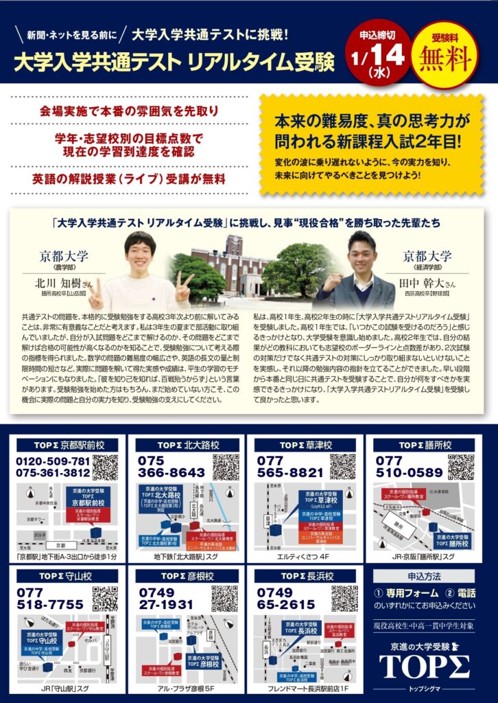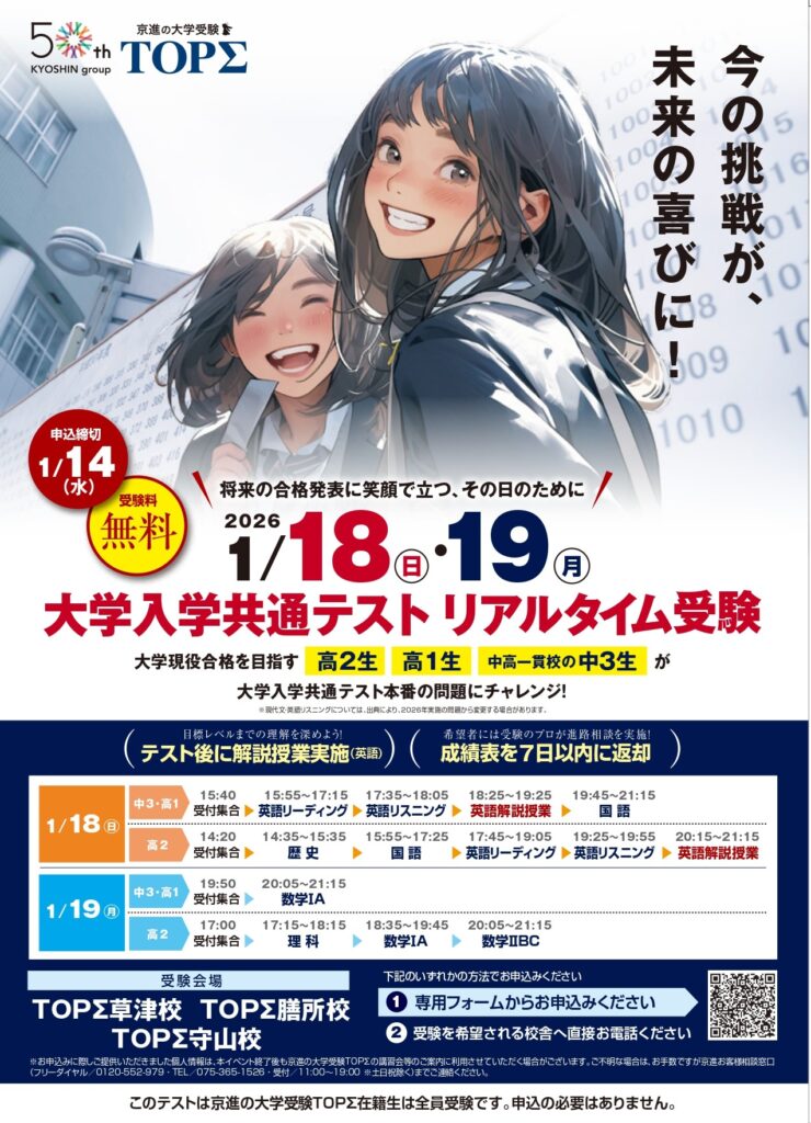 京進の大学受験 TOPΣ 草津校では、2026年の共通テストと同じ問題(現代文、英語リスニングについては出典により2026年の問題から変更する場合があります)が中3・高1・2生に挑戦する「共通テストリアルタイム受験2026」を開催!