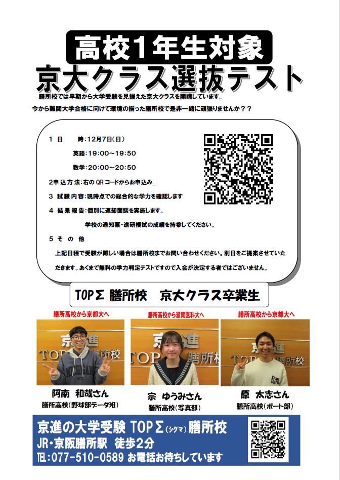 TOPΣ膳所校では早期から国内における最難関大学の受験を見据えたコース≪京大クラス≫を開講しています。高い目標をもった仲間と一緒に夢を追いかけませんか? 職員一同、皆さんとお逢い出来ることを楽しみにしています。