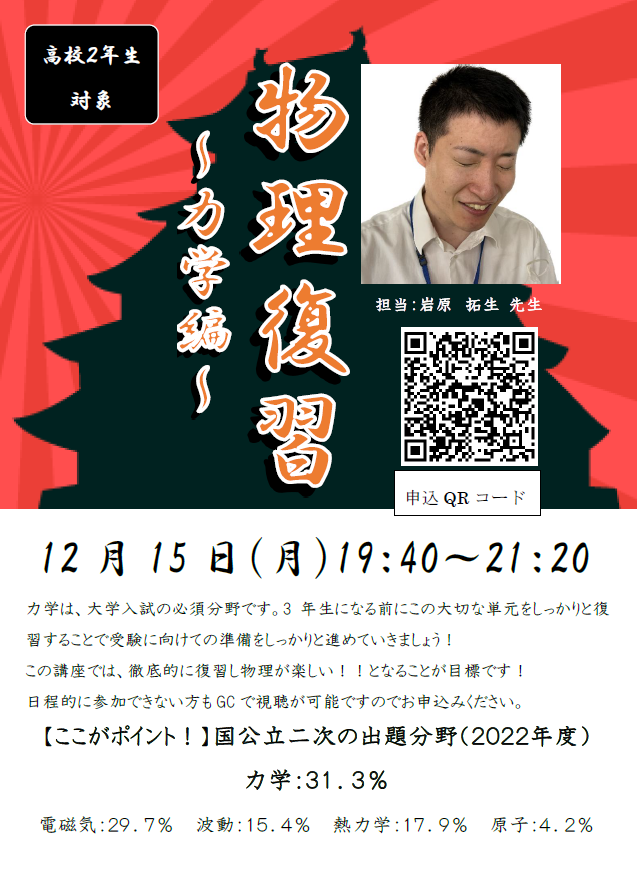 物理は理系生にとって避けては通れない科目です。(学部によってはこの通りではありません) やればやるほどにその壁の高さを実感しているのではないでしょうか? 今回、京進の大学受験TOPΣ膳所校では大学入試における必須分野である「力学」をしっかりと復習します。この講座を受ければ「物理って難しい…」から「物理って楽しいかも!」と変化した自分に出会えます。