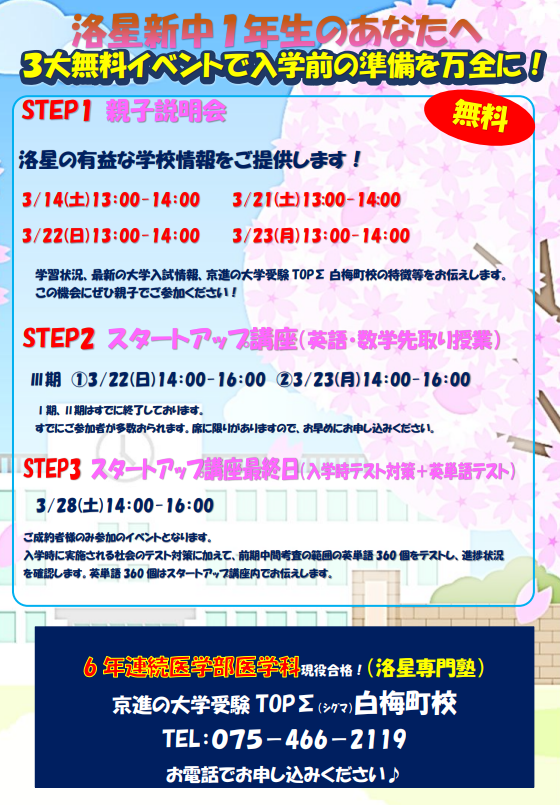 「勉強についていけるかな?」「部活と両立できるかな?」と、期待と不安が入り混じっている方も多いはず。 そこで!洛星専門塾である京進TOPΣ白梅町校では、入学前のスタートダッシュを応援する「3大無料イベント」を開催中です!🚀💪