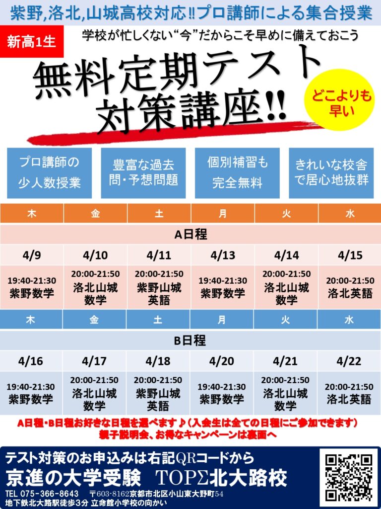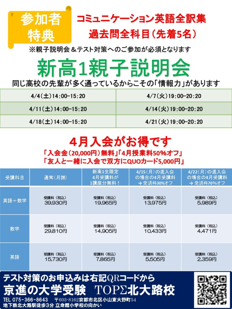 以下の通り、紫野・洛北・山城にご進学される新高1生対象の親子説明会や定期テスト対策を無料で実施致します。まずは親子説明会にて各高校の様子(定期テスト、課題、先輩の様子、大学合格実績等)、北大路校の取り組みについて詳しくお伝えしますのでぜひこの機会にご参加下さい。