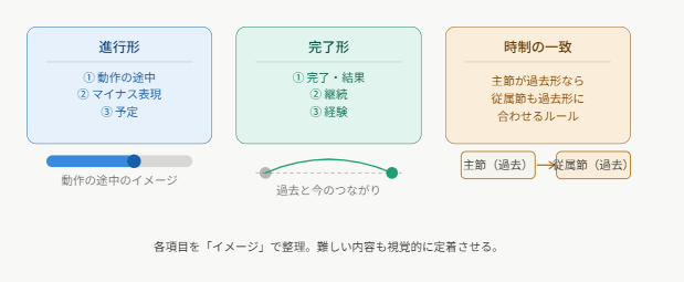 例えば「時を表す表現」というテーマの中に含まれる進行形・完了形・時制の一致などを、