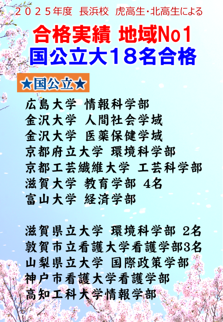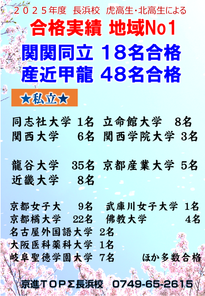 地域NO.1の合格実績の長浜校で、一緒に頑張ってみませんか。