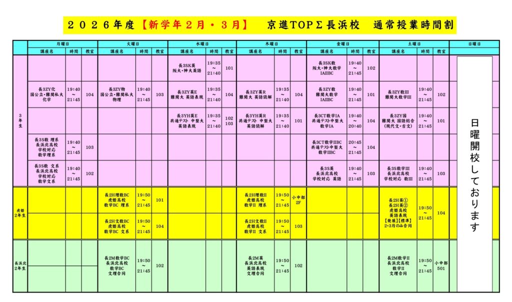 2026年2月からの時間割です